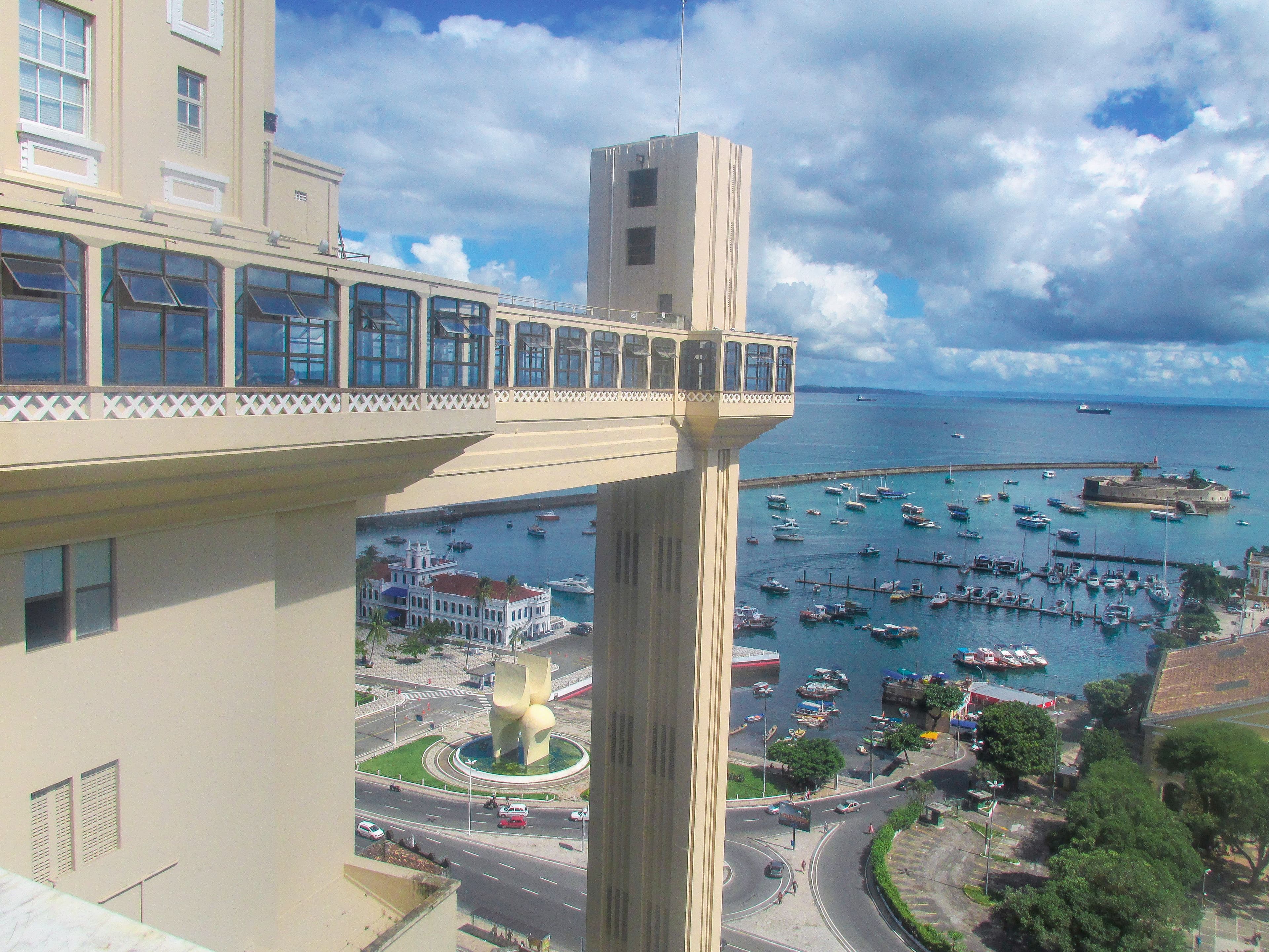 Elevador Lacerda, com Baía de Todos-os-Santos ao fundo, em Salvador (Foto: WikiCommons)