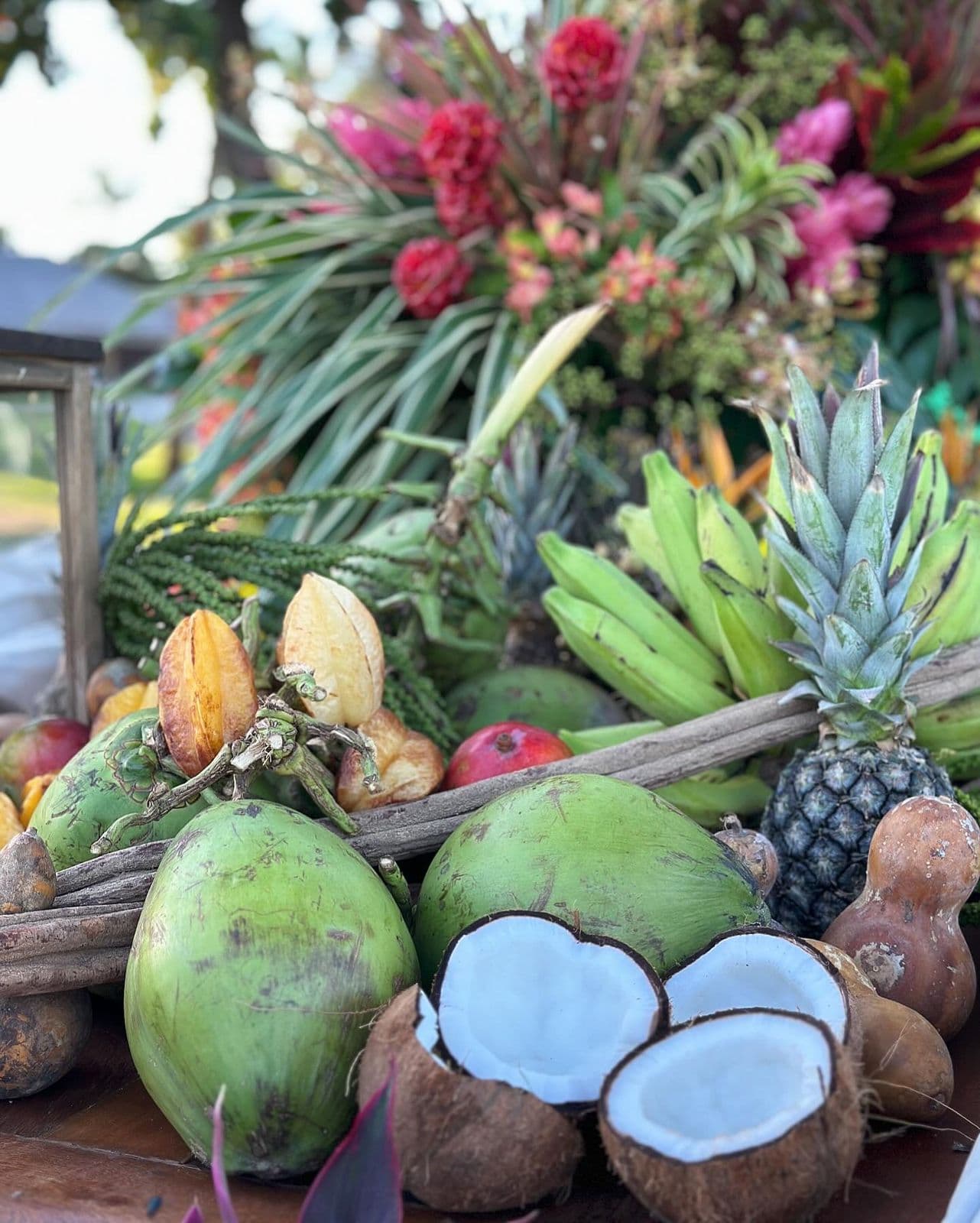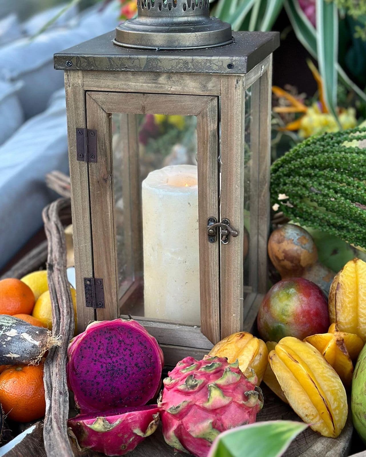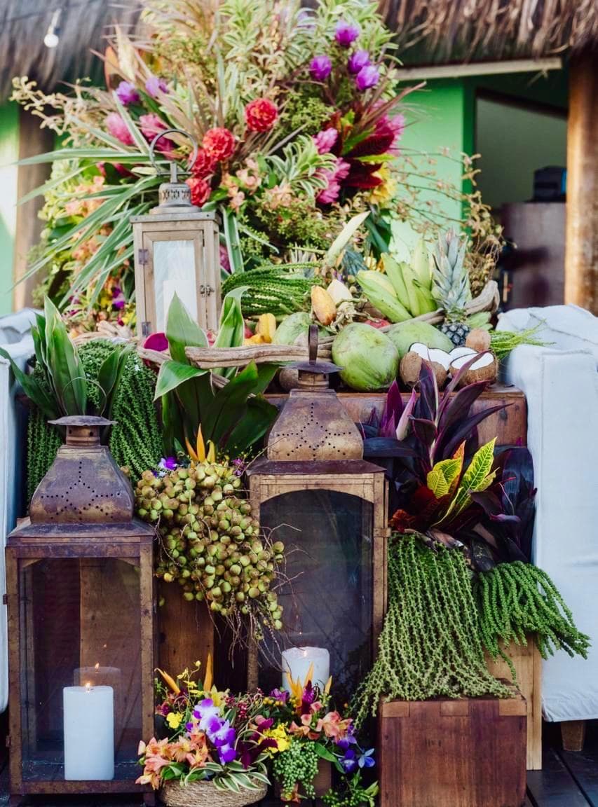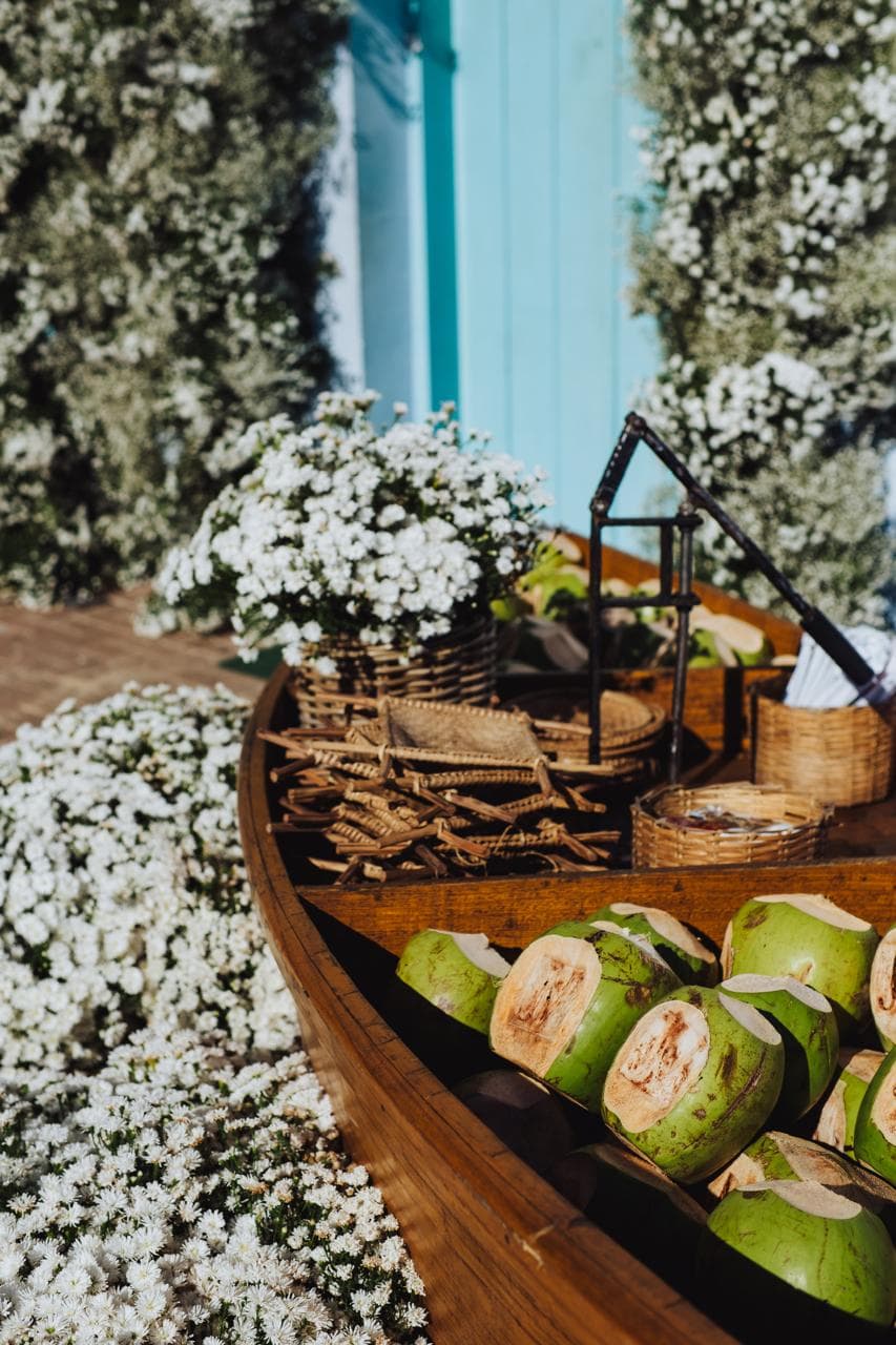 Nessa festa, a ideia foi exaltar o tropicalismo da região, através de arranjos florais que misturassem plantas, flores e sementes às frutas da época. Uma experiência sensorial que marcou com leveza, alegria e elegância o início das comemorações do Casamento de Je & Vini. Nessa festa, a paleta de cores quentes e vibrantes das flores e frutas se incorporaram aos variados tons de verde das plantas e folhagens. Para compor o ambiente seguindo o conceito orgânico proposto, móveis e adereços em madeira e corda náutica se misturam à lanternas com velas, sombreiro de macramê e luzes de gambiarra, tornando o mar de Praia de Forte ainda mais encantador e paradisíaco. BEM-VINDOS À BAHIA!