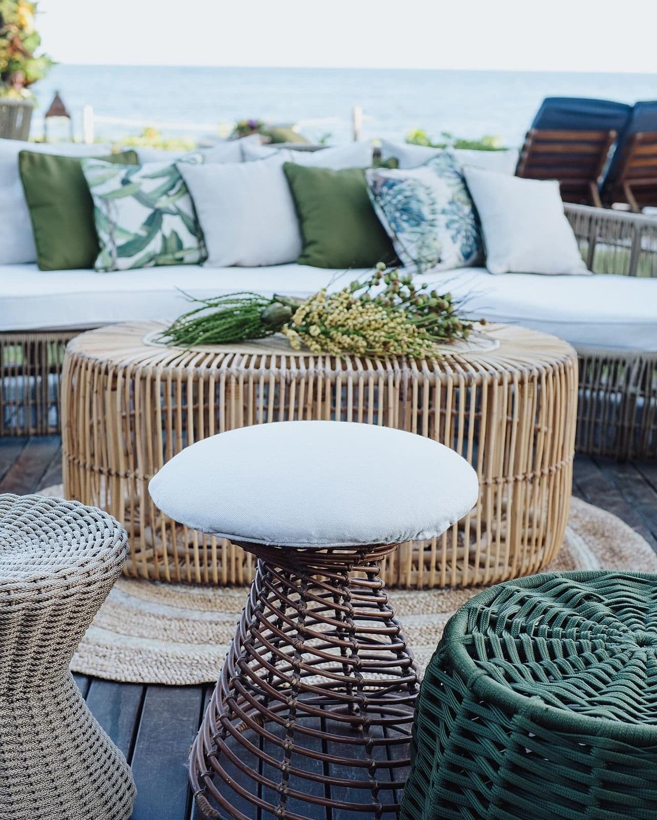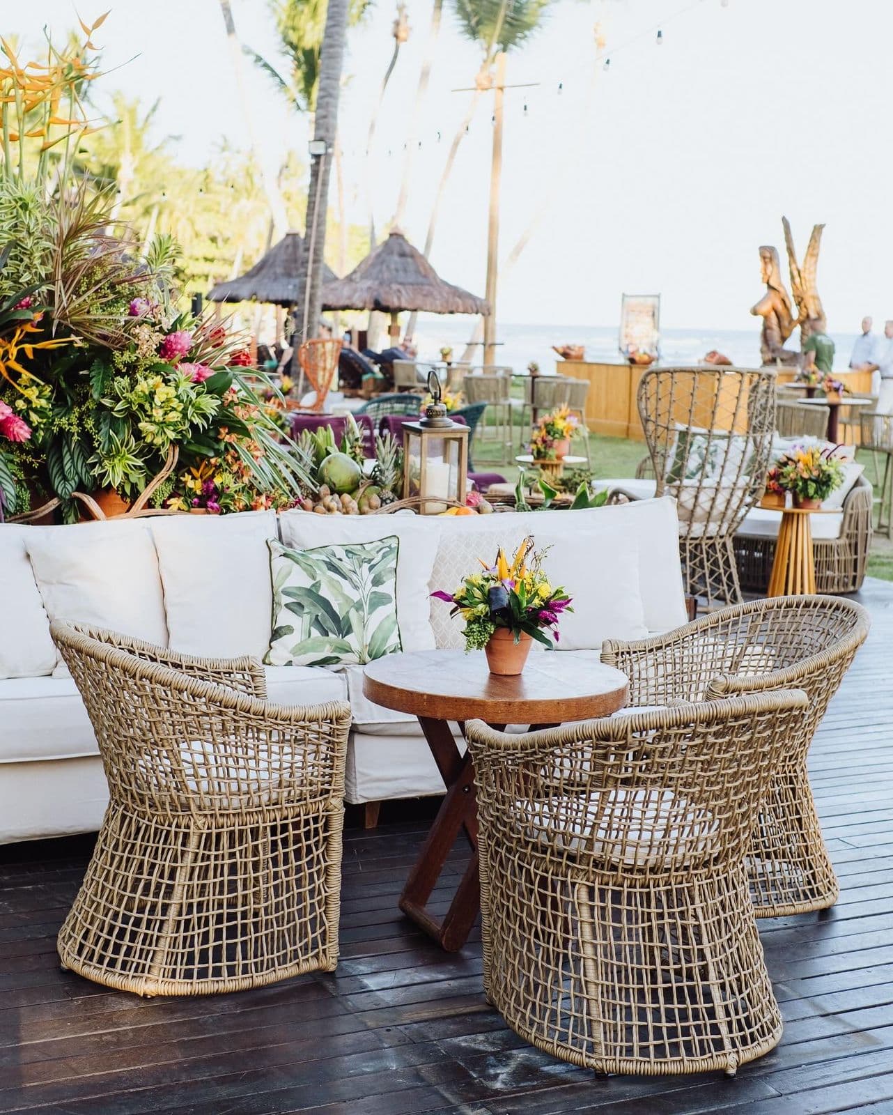 A proposta foi criar um ambiente acolhedor e sofisticado ao mesmo tempo, que tivesse o DNA jovem do casal, a exuberância do verde e a elegância de um mobiliário em madeira de demolição e estofaria nobre, num projeto que conciliasse estética, conforto aos convidados e funcionalidade logística. A decoração das 3 festas (luau de boas-vindas no Tabaréu, recepção na Igreja e festa na Casa da Torre) partiu do princípio orgânico, onde a inspiração vem da fluidez da natureza. Linhas curvas aparecem nos móveis e objetos, criando uma sintonia direta e incorporando a natureza e as riquezas do local, através da vegetação ou das diferentes texturas dos materiais nobres que compõem a “simplicidade rica” das peças artesanais da região. Festas charmosas, cheias de personalidade e com estilos diferenciados, mas com o princípio de unir o moderno e o rústico, o construído e o natural, criando um conceito leve e sofisticado, que tem como cenário a paradisíaca Praia do Forte.