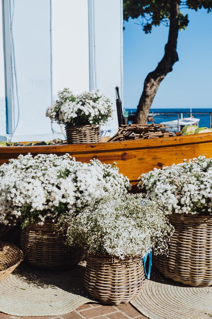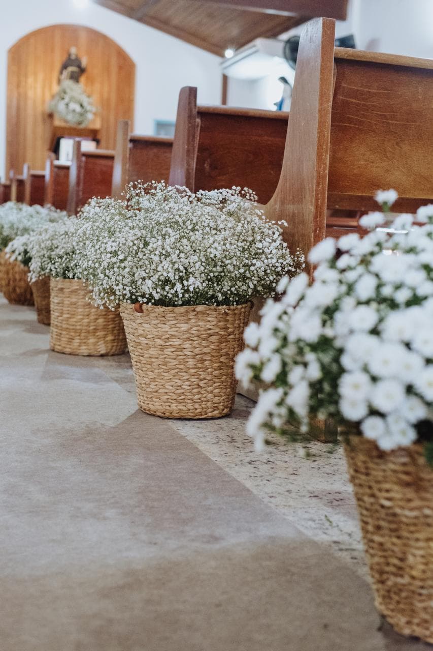 Arcos de flores em formato desconstruído e luminárias com velas compõem a fachada rústica da Igrejinha à beira mar. Na parte interna da igreja, a composição de vasos de tamanhos e formas diversas em cestarias manteve o clima intimista e acolhedor do espaço. Para a igreja, a paleta de cores seguiu nos tons de verde e branco.