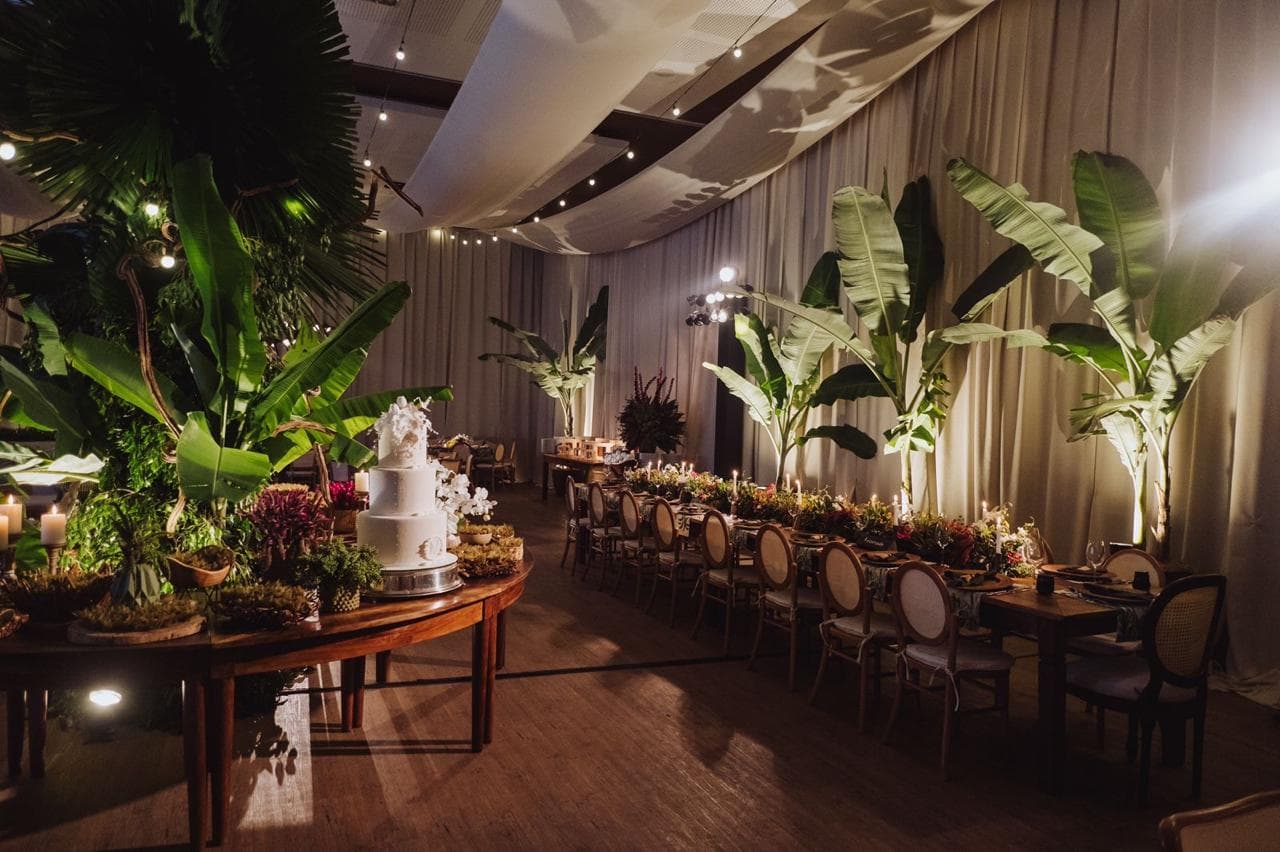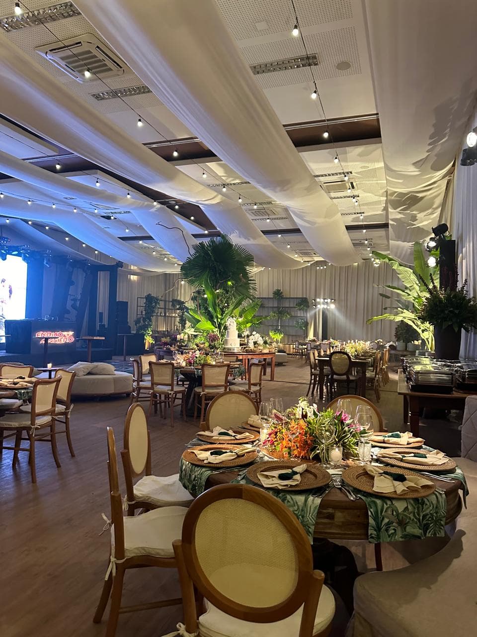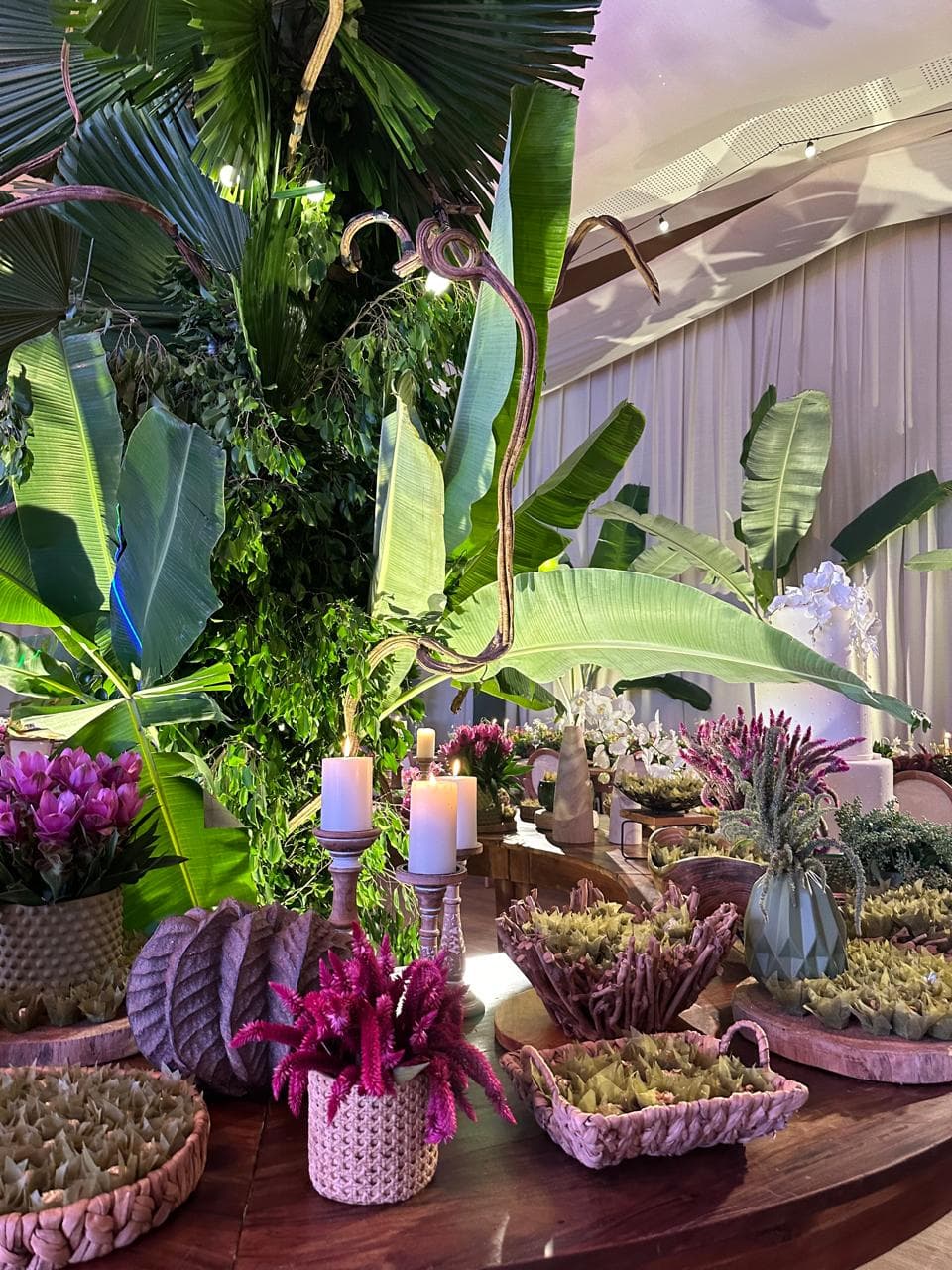 A paleta de cores do evento possui os tons de verde, branco, pink e alaranjado. No mobiliário, tons de off-white e nude, misturaram-se às peças e elementos amadeirados. O conceito da festa se fortaleceu através dos arranjos desconstruídos, com muitas sementes, plantas e flores nobres trabalhadas por blocos de cor.