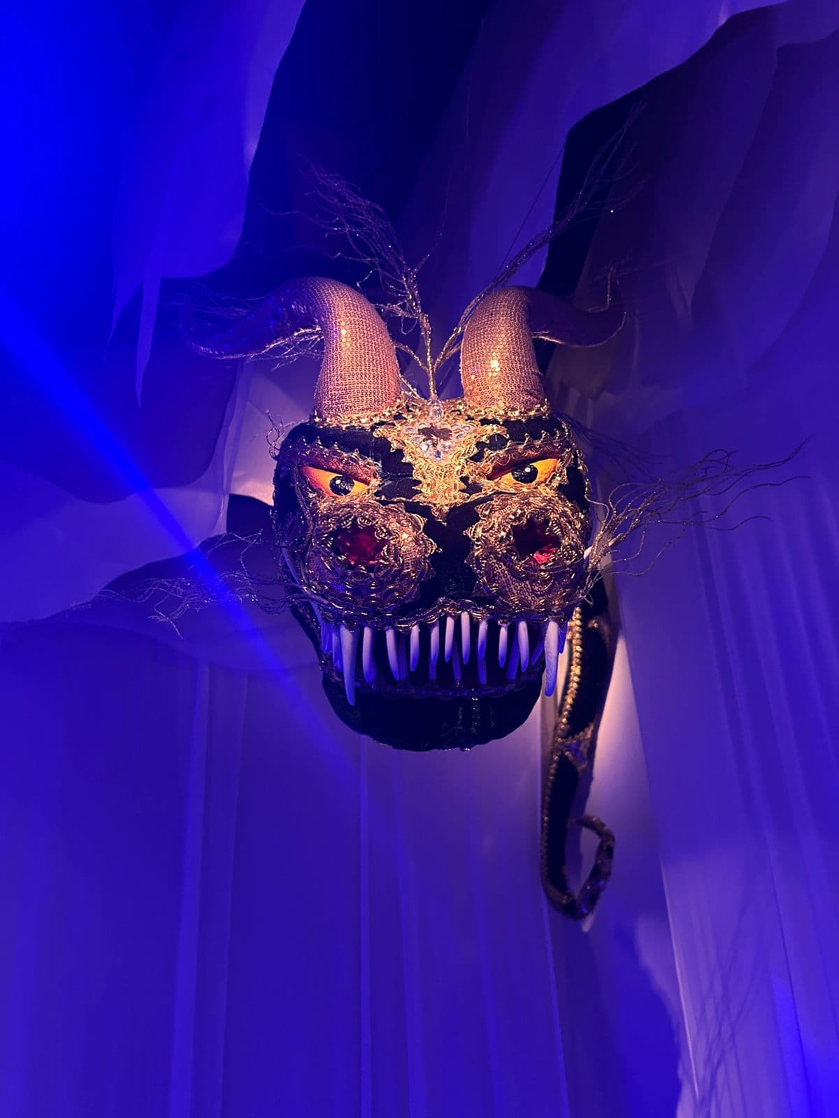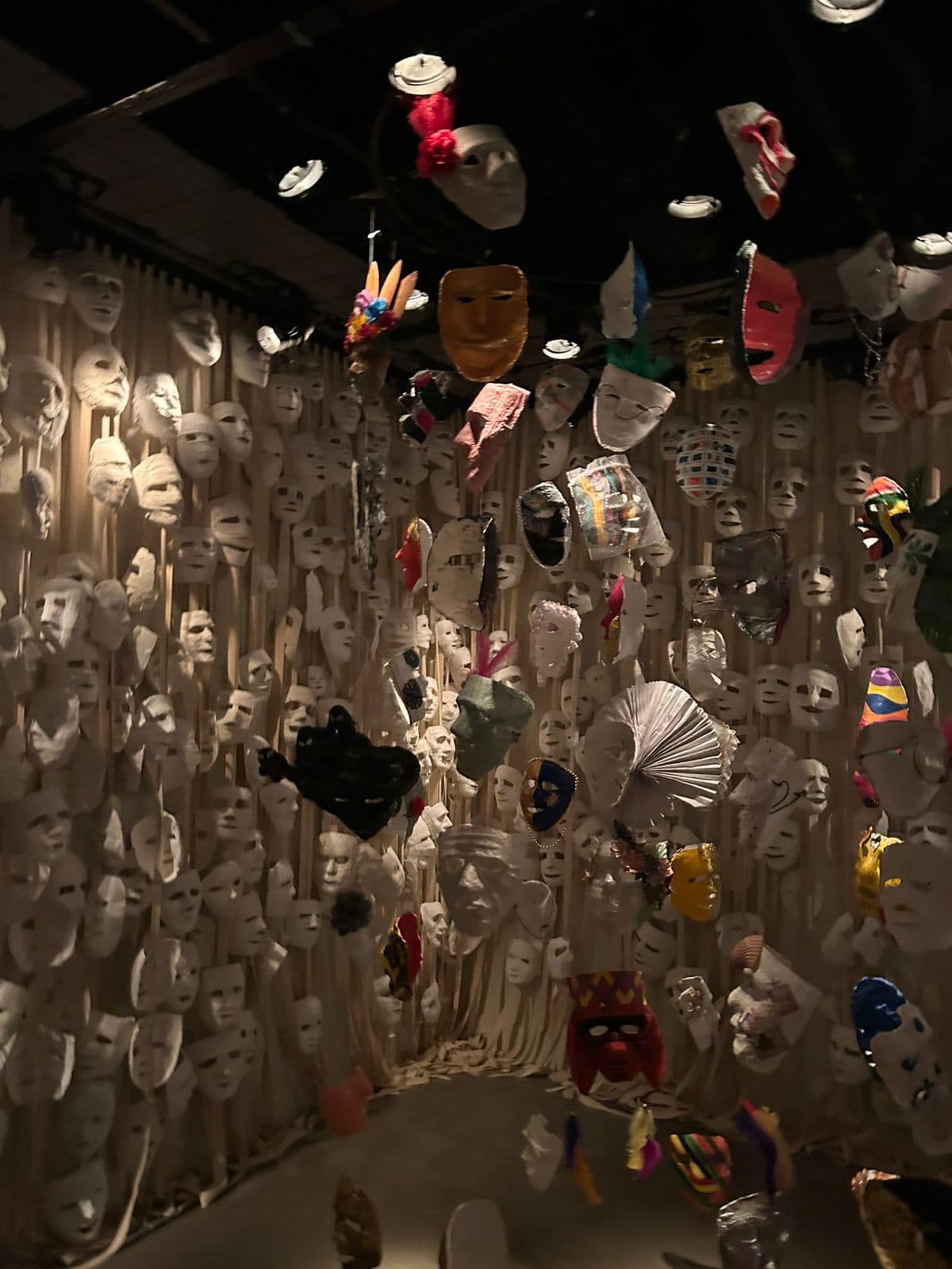 Sala repleta de máscaras suspensas propõe uma reflexão sobre os múltiplos papéis sociais, personas e identidades que compõem o indivíduo, tema recorrente na psicologia analítica de Jung (Foto: Arquivo Pessoal)